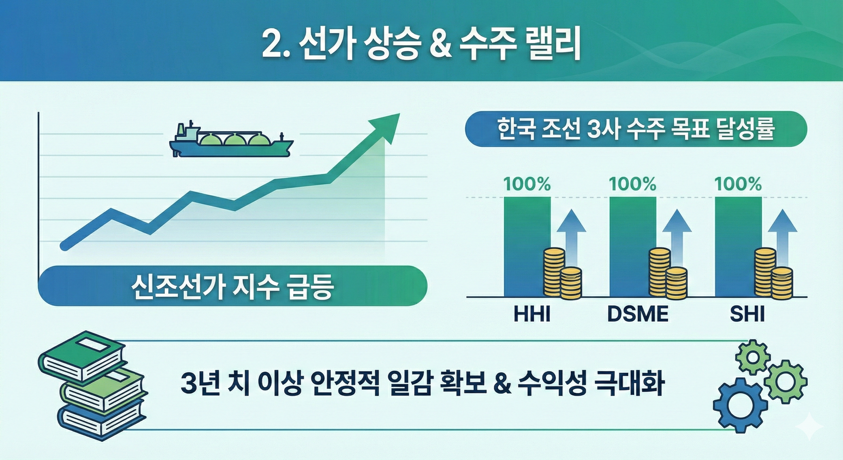 도크가 꽉 찼다는 것은 무엇을 의미할까요? 조선소가 '골라 받기'를 할 수 있다는 뜻입니다. 돈이 안 되는 저가 수주는 걷어차고, 마진이 많이 남는 고부가가치 선박만 선별해서 수주하는 '수익성 위주의 경영'이 가능해진 것이죠.